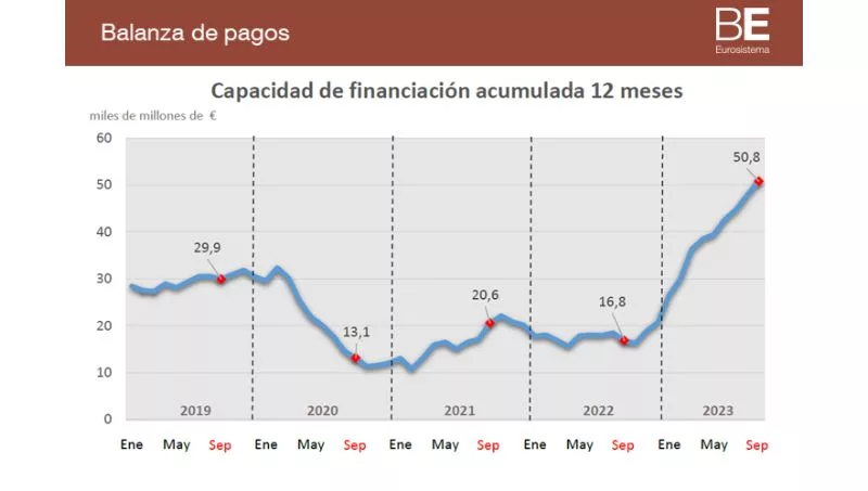 El turismo contribuyó con un saldo de 6,8 mm (5,5 mm el mismo mes de 2022), con unas tasas de crecimiento del 23% en los ingresos y del 18% en los pagos. Por su parte, los bienes y servicios no turísticos mostraron un déficit de 0,8 mm (frente al déficit de 4,3 mm de septiembre de 2022), registrando tasas de variación interanual del -8% en ingresos y del -14% en pagos. Las rentas primaria y secundaria registraron un déficit de 2,5 mm (frente al de 0,7 mm del mismo mes de 2022) y la cuenta de capital presentó un superávit de 0,9 mm (1,1 en septiembre de 2022). En términos acumulados de 12 meses, en septiembre de 2023, la capacidad de financiación se situó en 50,8 mm, superior a la de 16,8 mm acumulada en septiembre de 2022. Por componentes, el superávit de la balanza por cuenta corriente fue de 37,4 mm (5,1 mm en 2022). La reducción del déficit de bienes y servicios no turísticos (en 34,1 mm) y la ampliación del superávit del turismo (en 11,3 mm) superaron ampliamente la caída del saldo de las rentas primaria y secundaria (que fue de 13,2 mm).