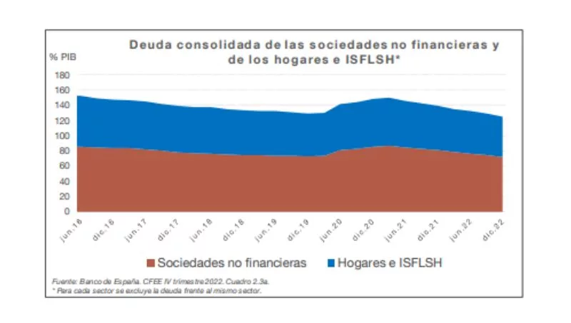 Las empresas y los hogares contribuyeron con distinta intensidad a esta evolución. La deuda consolidada de las sociedades no financieras se redujo desde los 978,1 mm de diciembre de 2021 a los 957,6 mm en diciembre de 2022. En términos del PIB la ratio disminuyó desde el 81% de diciembre de 2021 hasta el 72,2% a finales de 2022 (si se incluyese la deuda interempresarial, la ratio en 2022 sería un 93,4%, frente a 104,5% en 2021). La deuda de los hogares e ISFLSH se redujo ligeramente de 704,2 mm en diciembre de 2021 a 702,8 mm al cierre de 2022 (707,5 mm en diciembre de 2019). La ratio sobre el PIB disminuyó hasta el 53%, desde el 58,4% del último trimestre de 2021.