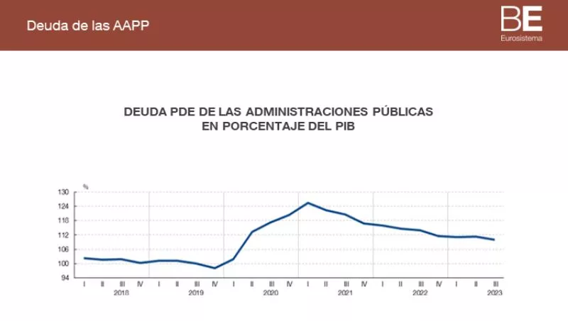 En cuanto a la evolución de la deuda de los distintos subsectores de las Administraciones Públicas, el saldo de la deuda del conjunto de la Administración Central se elevó a 1.435 mm de euros en septiembre de 2023, lo que representa el 99,9% del PIB. El crecimiento, en términos interanuales, de la deuda de este subsector en el tercer trimestre de 2023 fue del 5,5%.