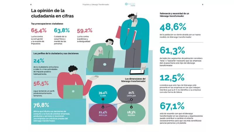 El estudio identifica cuatro dimensiones clave en el liderazgo transformador -Cuida, Inspira, Cataliza, Impulsa- y la más valorada es la de Cuidar, que pone el foco en tener un propósito de impacto positivo que vaya más allá del beneficio económico y pensar en el bienestar social, con un 39,4%, seguida de la capacidad de adaptación a los cambios sociales (21,4%), la promoción de la empatía y la libertad de los equipos (21%) y el fomento de la innovación y la creatividad (18,3%). Sin embargo, aunque el 61,3% de la población considera necesario que las empresas avancen hacia este modelo de liderazgo, sigue siendo el menos identificado en el ámbito empresarial.