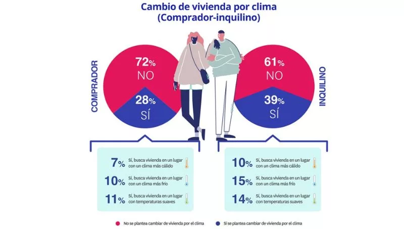 En el lado de los compradores las cifras son más bajas, como corresponde a una decisión que, en su caso, reviste una mayor envergadura. De este modo, el porcentaje de los demandantes de vivienda en propiedad que tienen en mente un cambio por motivos climáticos se queda en el 28%, aunque también experimenta un incremento sobre 2022, cuando era del 25%.