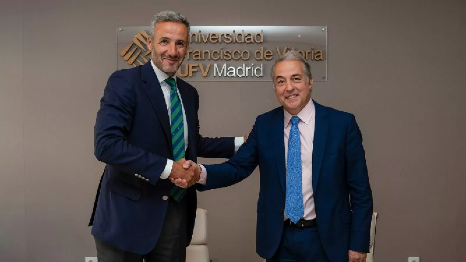 El director general de Madrileña Red de Gas, Alejandro Lafarga, y el vicerrector de Investigación de la Universidad Francisco de Vitoria, Alberto López Rosado, han sellado el acuerdo en la Sala de Juntas de Rectorado de la UFV.