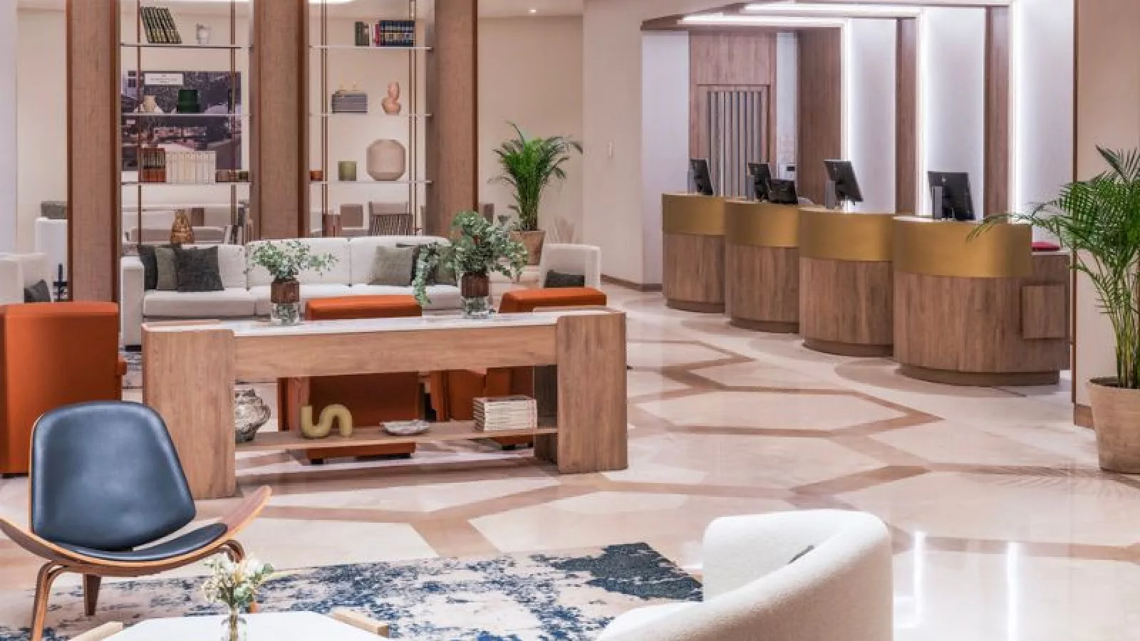La remodelación ha resultado en 414 habitaciones y suites distribuidas en dos torres, que ofrecen un diseño moderno con acabados de alta calidad y mobiliario atemporal, ideal tanto para el viajero de negocios como para el de ocio. El interiorismo presenta una paleta de colores en tonos beige y azul, alineada con los estándares de la marca Marriott Hotels. El diseño ha sido realizado por el Estudio Caramba, especializado en interiorismo para hoteles de lujo, que ha aportado un carácter diferencial y de alta calidad al proyecto de interiorismo.