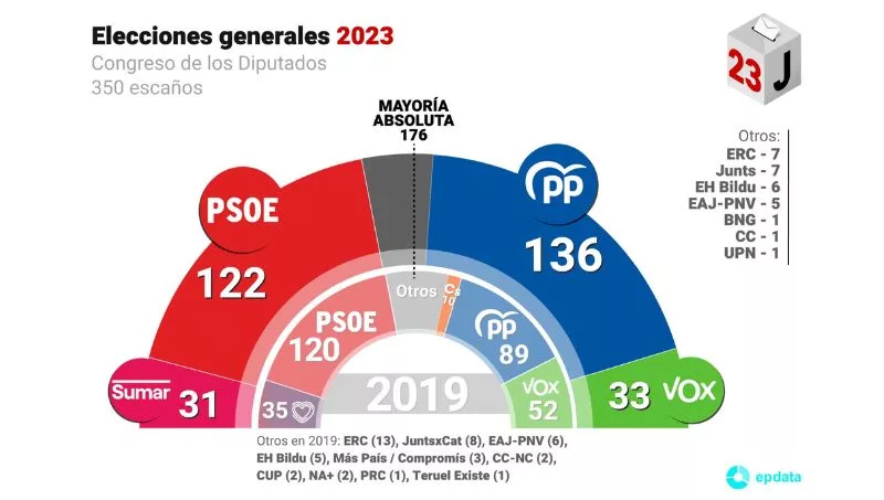 El PP (con Alberto Núñez Feijóo) ha vuelto a ganar las elecciones generales, triunfando en 40 de las 52 provincias de España con 8 millones de votos. Pero esto no será suficiente, no suma con Vox para una mayoría absoluta y no podrá gobernar. Es la primera vez en democracia que el partido que gana las elecciones no podría gobernar.