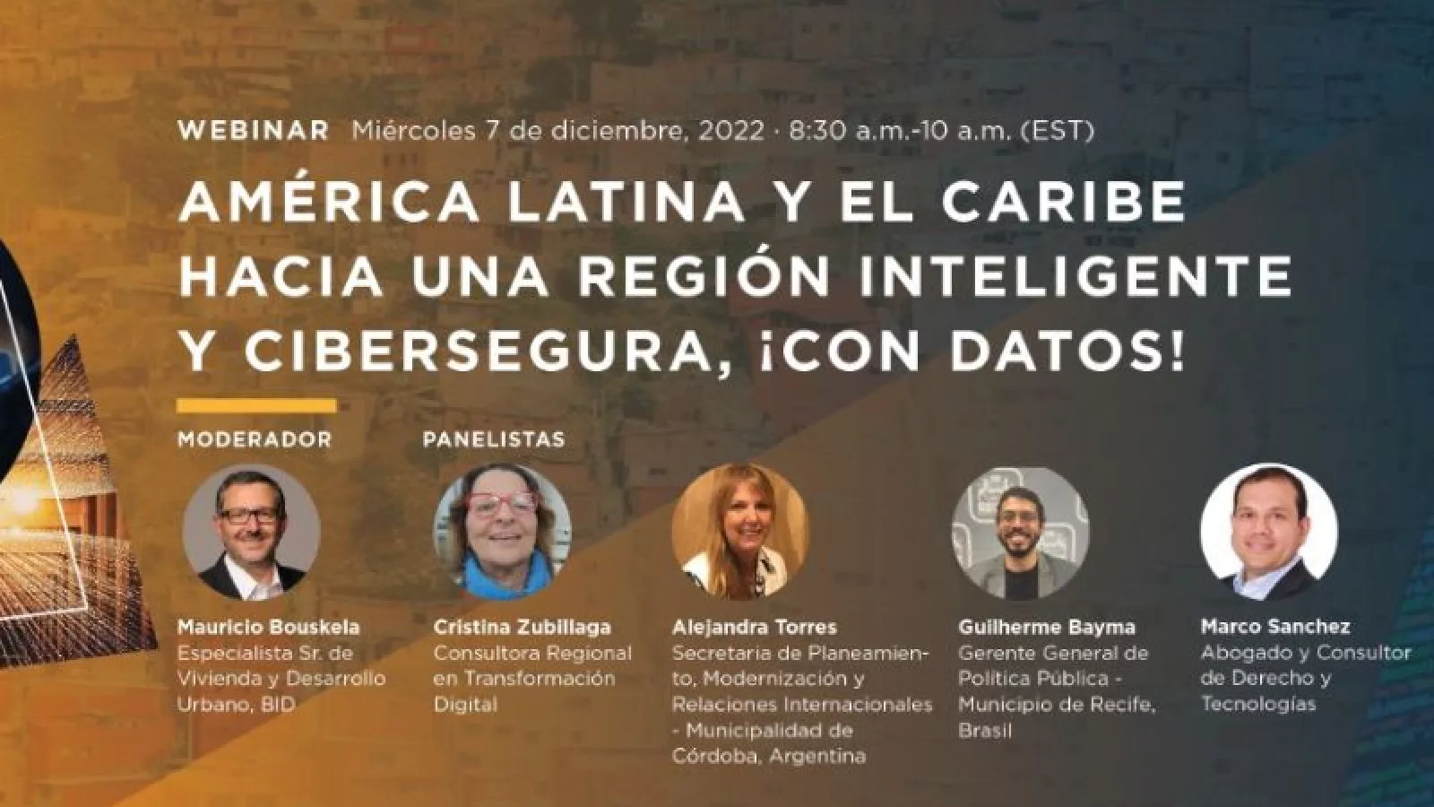 Participarán como panelistas, además de Torres, Cristina Zubilaga, Consultora Regional en Transformación Digital de Uruguay; Guilherme Bayma, Gerente General de Política Pública de Recife de Brasil; Marco Sánchez, Consultor de Derecho y Tecnologías de Colombia. Moderará la actividad Mauricio Bouskela, especialista en Vivienda y Desarrollo Urbano de BID desde Estados Unidos.
