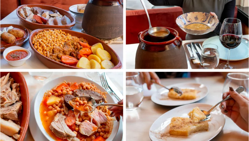 El menú comienza con unas croquetas de cocido, acompañadas de guindillas y cebolletas. A continuación, la sopa de cocido con fideos, seguido de un plato de garbanzos castellanos y verdura. Para terminar, una ración de carnes: morcillo, tocino, panceta, costillas, chorizo, morcilla y gallina, junto a la salsa de tomate con cominos. Y para el broche final, el postre más dulce: una deliciosa leche frita.