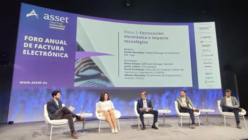 La mesa de debate sobre “Facturación electrónica e impacto tecnológico” estuvo protagonizada por Diana Salazar, junto a Javier Lafont, CTO de Invoway, David Sarmiento, dirección de Compras, Cadena de Suministro y Operaciones en ILUNION, y Alberto Mezquita, responsable de Organización y Sistemas en Froneri. El objetivo de la charla fue abordar cómo las nuevas herramientas tecnológicas de facturación electrónica están facilitando el trabajo de los equipos internos y el futuro inminente que espera a las grandes y pequeñas empresas en su adopción.