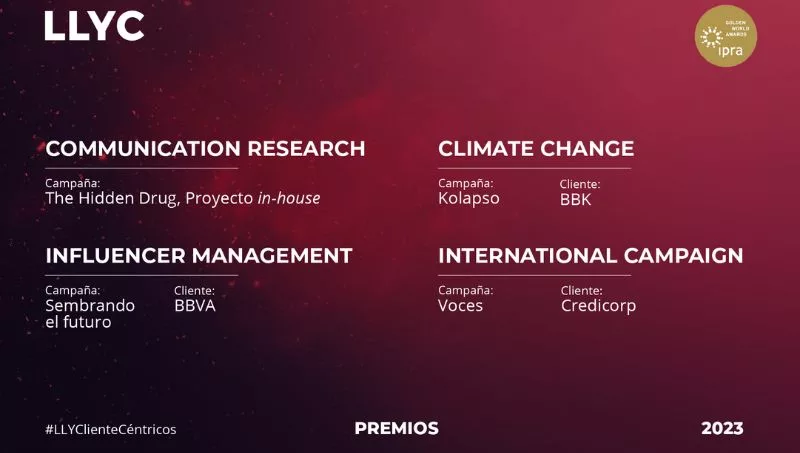 En concreto, los proyectos distinguidos han sido: ‘The Hidden Drug (THD)’, la campaña contra la polarización desarrollada con Más Democracia, en la categoría Communication research; ‘Sembrando el futuro’, para BBVA en Influencer management; ‘Kolapso’, para BBK en la categoría Climate Change; y ‘Voces’, para Credicorp en International campaign. La gala de entrega de estos premios, organizados por la Asociación Internacional de Relaciones Públicas, se celebrará el 20 de octubre en Barcelona.