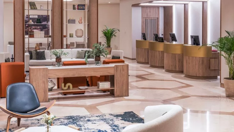 La remodelación ha resultado en 414 habitaciones y suites distribuidas en dos torres, que ofrecen un diseño moderno con acabados de alta calidad y mobiliario atemporal, ideal tanto para el viajero de negocios como para el de ocio. El interiorismo presenta una paleta de colores en tonos beige y azul, alineada con los estándares de la marca Marriott Hotels. El diseño ha sido realizado por el Estudio Caramba, especializado en interiorismo para hoteles de lujo, que ha aportado un carácter diferencial y de alta calidad al proyecto de interiorismo.