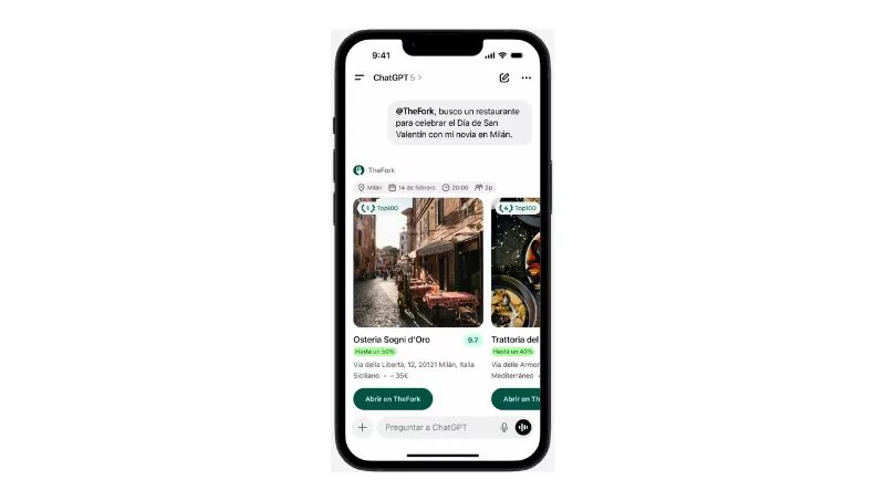 Gracias a este acuerdo, los comensales van a poder hablar directamente con ChatGPT para descubrir restaurantes en tiempo real y reservar a través de TheFork. Gracias a esta integración, tendrán la posibilidad de preguntar dónde comer, especificar un tipo de cocina, elegir un barrio o mencionar una ocasión especial. Como respuesta, ChatGPT mostrará directamente la aplicación de TheFork, con una selección cuidada de restaurantes disponibles en la plataforma, incluyendo fotos, valoraciones, ofertas especiales y disponibilidad, con el objetivo de que reservar mesa lleve solo unos segundos.