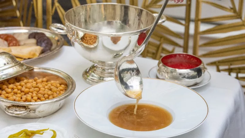 Los tres vuelcos que componen el cocido se sirven en bandeja de plata, tal y como se hacía tradicionalmente en el hotel.